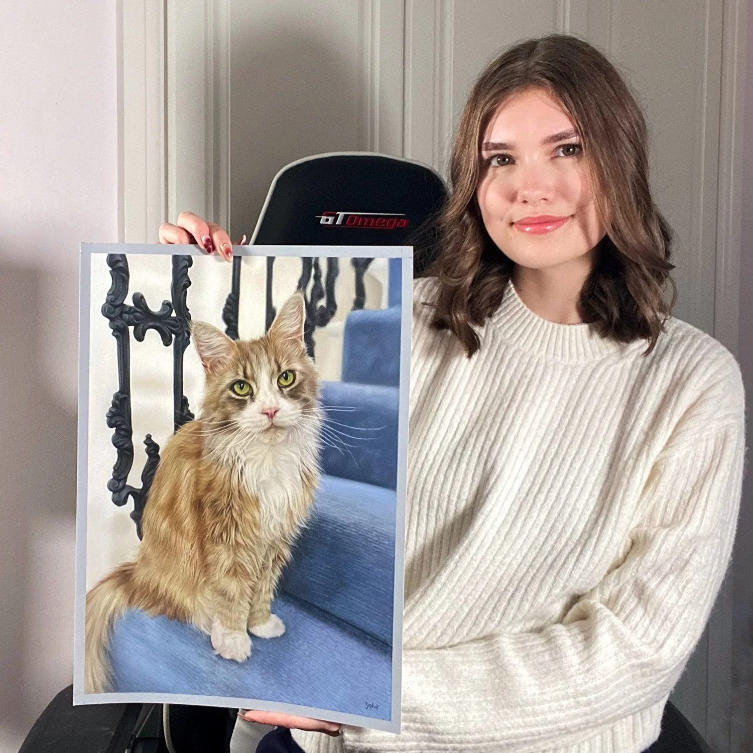 The first one was a special commission of two A3 portraits — a pair of beautiful, much-loved cats. The client wanted each portrait to be unique yet clearly part of a set. We decided on matching backgrounds: both cats posed on the staircase, one sitting alert and upright and the other lounging in a characteristically relaxed pose.